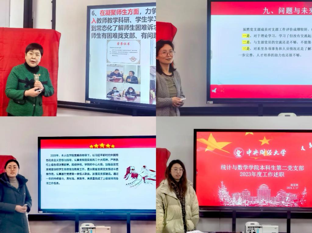 在本年度述职评议考核大会上,共4位党支部书记(尹钊:数量经济系教工党支部;梁超:数理统计系教工党支部;孙悦:本科生第一党支部;赵雪琪:本科生第二党支部)进行现场述职,其他9个党支部或书记进行书面述职。
