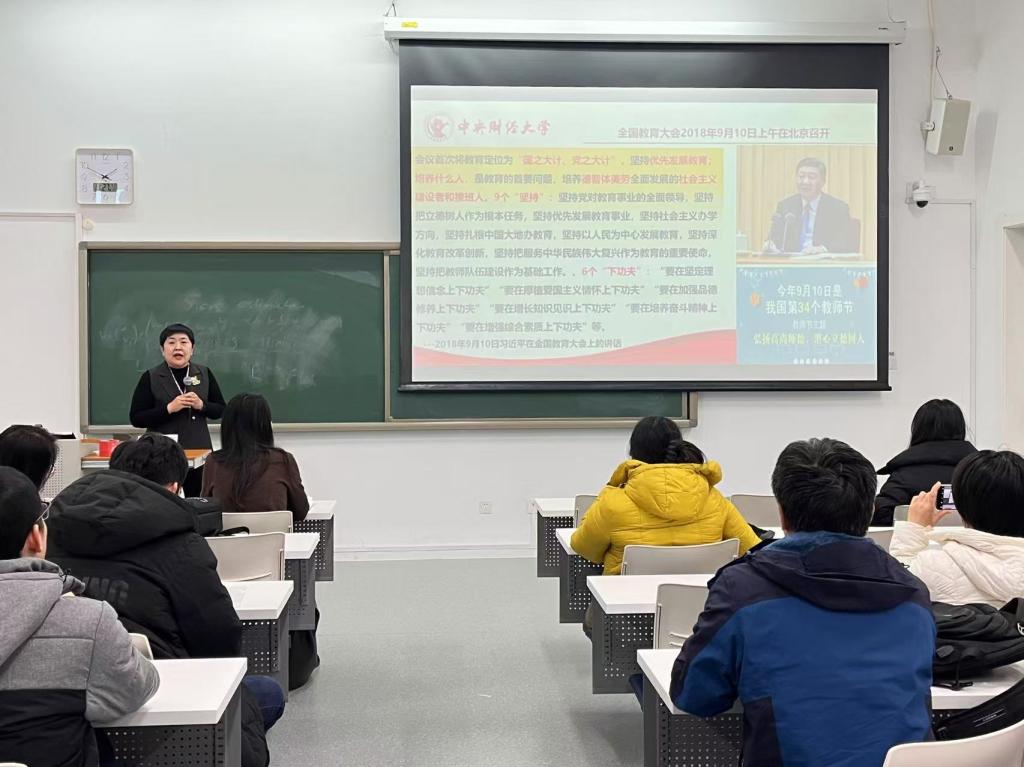 其次尹钊老师结合弘扬教育家精神,结合自身35年教育工作经历,分享了三点心得体会。一是坚持问卷调查·学情分析,二是坚持员工中心·问题导向,三是坚持爱为底色·温度教学。