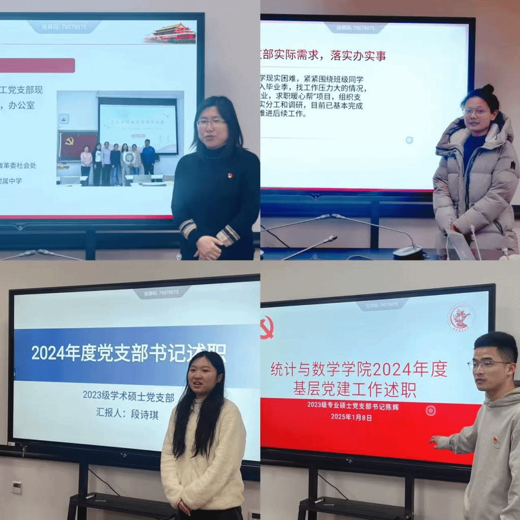 在本年度党支部书记考核大会上,共4位支部书记(秦林霞: 运筹与计算科学系教工党支部;赵晨:2022级学术硕士党支部;段诗琪:2023级学术硕士党支部;陈辉:2023级专业硕士党支部)进行现场述职,其他10个党支部进行书面述职。紧密围绕党支部书记在抓支部建设等方面所做的工作、存在的主要问题及原因、下一步工作思路和主要措施,对支部工作进行全面阐述,分享了各自的经验做法。