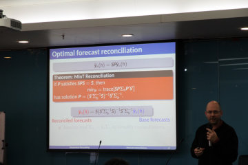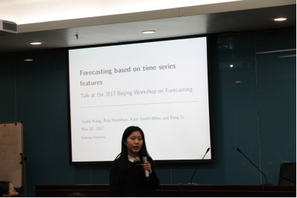 下午会议的第二个议题内容是“概率预测”,Hyndman教授讲解“概率分层预测”,对分层时间序列数据中的重要概念进行了定义,并在多种假定条件下进行了研究,将结果展示给了在场的各位嘉宾。李丰博士做了“基于协变量相关的条件Copula预测”为题的演讲,李丰博士详细介绍了贝叶斯方法和蒙特卡洛在复杂时间序列模型预测的应用。随后,由北京航空航天大学的康雁飞教授作了题为“时间序列特征空间预测”的报告,她提出对时间序列数据集特征空间降维并利用特征空间对预测方法进行选择的时间序列预测方法。该项目受“英国上市公司365教师邀请海外学术伙伴来校开展合作科研项目”资助,项目号:HZKY20170025。