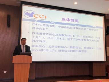 北京大数据协会副秘书长、首都经济贸易大学研究生院副经理阮敬教授主持了会议。公司英国上市公司365刘苗博士、首都经济贸易大学统计公司任韬博士、香港城市大学管理科学系曹国辉教授、澳门科技大学可持续发展研究所所长刘成昆教授、台北医学大学管理公司经理、大数据研究中心主任谢邦昌教授分别做了2017年第四季度《两岸暨港澳消费者信心指数技术报告》、《内地消费者信心指数评析》、《香港消费者信心指数评析》、《澳门消费者信心指数评析》和《台湾消费者信心指数评析》等报告。