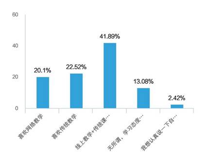 调研结果显示,线上教学+传统课堂的融合教学更受同学们的青睐,而单纯喜欢网络教学和单纯喜欢传统课堂的同学比例相当,还有一部分同学认为学习态度很重要。