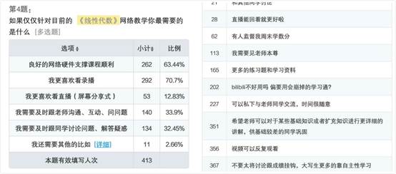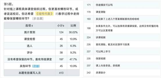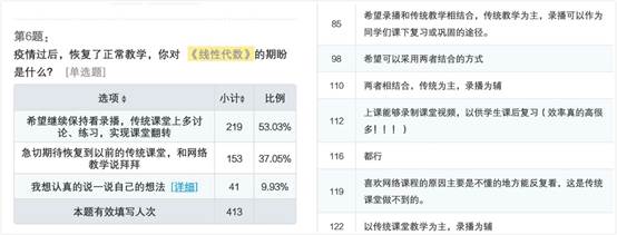 调研六、疫情过后,恢复了正常教学,你对《线性代数》课程的期盼是什么?(“学”之调研,数据实时更新,有效回答413人)