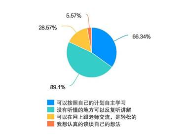 调研结果显示,线上教学有线上教学的优点,在学习自主性、自由安排、方便复习方面,有一定的优势。