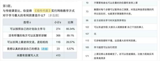 调研三、与传统课堂比,你觉得《线性代数》实行网络教学方式对于学习最大的有利因素是什么?(多选题)(“学”之调研,数据实时更新,有效回答413人)