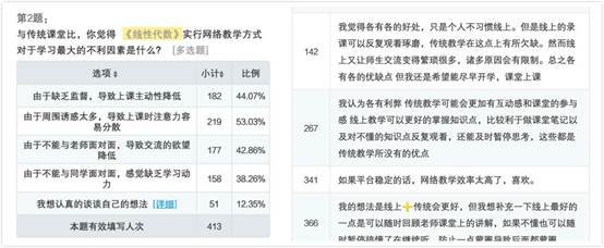 调研一、目前的《线性代数》网上教学形式比着传统教学你感觉如何?(“学”之调研,数据实时更新,有效回答413人)