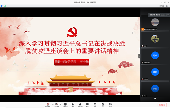 会上,李全敏老师首先介绍了脱贫攻坚战役过程中发改委等部门发布的几组数据,以及习近平总书记自2015年以来在不同省市主持召开的7次脱贫攻坚会议情况。接着,从攻坚目标不变、攻坚要求不变、攻坚态度不变三方面解读了此次决战决胜脱贫攻坚座谈会的会议精神。结合校、院今年的中心工作,她还谈到扶贫工作牵动着全国亿万人的心,全校教职员工都以不同的方式投入到力所能及的帮扶中,包括公司所有老师均做到了积极参与,发挥高校教师之力,力争为脱贫攻坚事业做出应有贡献。也体现了老师们用打赢脱贫攻坚战的实际行动践行增强“四个意识”、坚定“四个自信”、做到“两个维护”的根本要求。