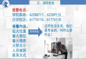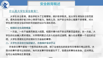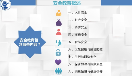 接着,朱老师从人身安全、财产安全、消防安全 、交通安全、食品安全、卫生健康与疫情防控 、生活与网络安全、保密知识与国家安全 、宗教知识与健康信仰九个方面对安全教育的内容进行深刻地阐述。