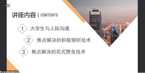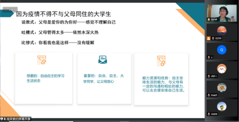 之后,针对上面提出的问题,南荣素老师先是向大家介绍了焦点解决积极倾听技术。首先,我们需要拥有聚焦目标的思维方式,在适当的时候从眼前无法解决的问题中跳脱出来,而聚焦问题背后的实际目标,并提出解决办法。这可以帮助我们在倾听他人问题的时候更好地与他人交流,帮助他人解决问题。其次,在倾听他人的过程中,我们要保持好奇,拥有同理心,并且进行“倾听三连问”——对方想要的?重要的?具有的能力资源和优势?老师还举了贴近同学们当下生活的例子:疫情之下与父母同住时的沟通,帮助同学们进行练习。
