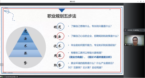 秦明坤老师指出,即将进入职场的我们,更需要的是未来2-3年内的职业规划,并且面试官抛出这一问题的原因,是想要了解面试者愿意为应聘岗位付出努力的程度。随后,老师又介绍了“道法术器势”职业规划五步法:以“器”明“道”对自身进行建立清晰认识,找准自身与职业的差距,明确发展方向,帮助同学们制定自己的职业规划。