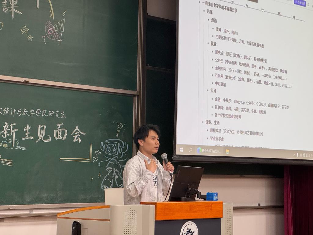 22级硕士研究生禹舜随后为新生们介绍了公司研会各部门的日常工作情况,鼓励大家积极参与到研会的招新工作中,为公司建设共同出一份力。接着从同龄人的视角,和同学们分享了自己在研究生生活中的亲身经历和体验,在职业方向选择、课程考核和学术竞赛上向新生同学们提供了满满的干货分享。