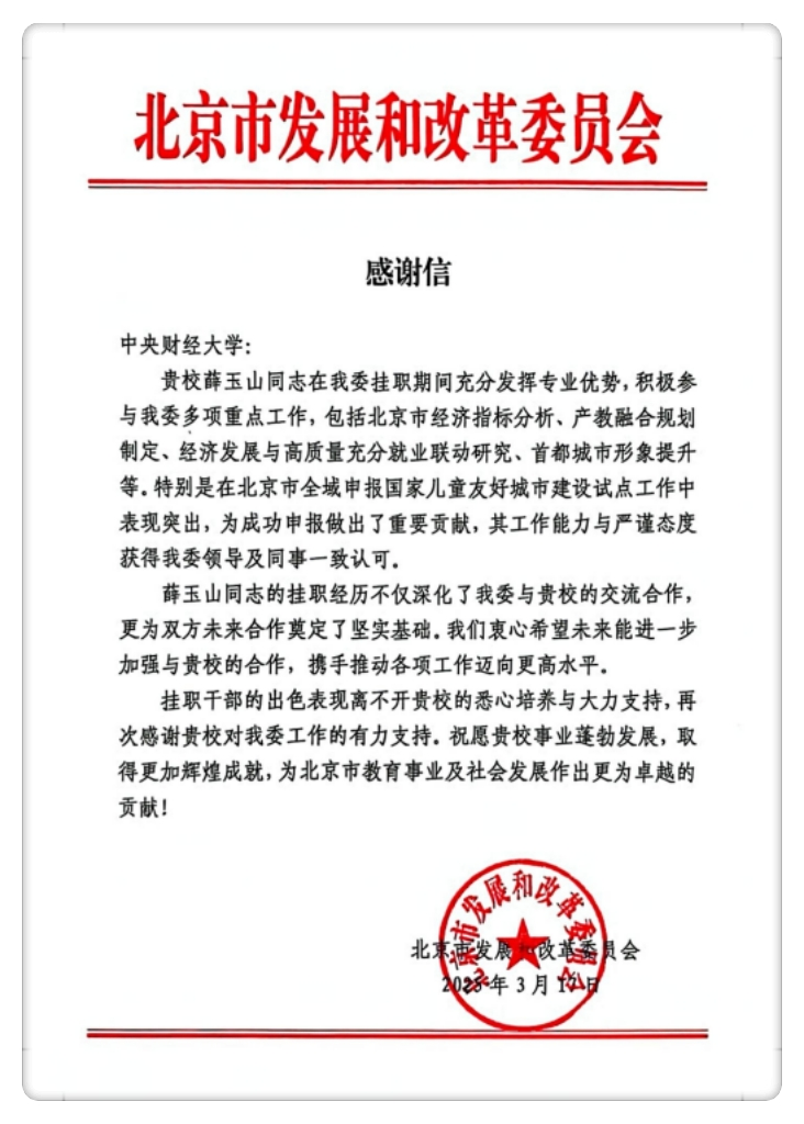信中表示,薛玉山同志在挂职期间充分发挥专业优势,积极参与多项重点工作,包括北京市经济指标分析、产教融合规划制定、经济发展与高质量充分就业联动研究、首都城市形象提升等。特别是在北京市全域申报国家儿童友好城市建设试点工作中表现突出,为成功申报做出了重要贡献,其工作能力与严谨态度获得了一致认可。其衷心希望未来能进一步加强与公司的合作,携手推动各项工作迈向更高水平。同时,祝愿公司事业蓬勃发展,取得更加辉煌成就,为北京市教育事业及社会发展作出更为卓越的贡献!