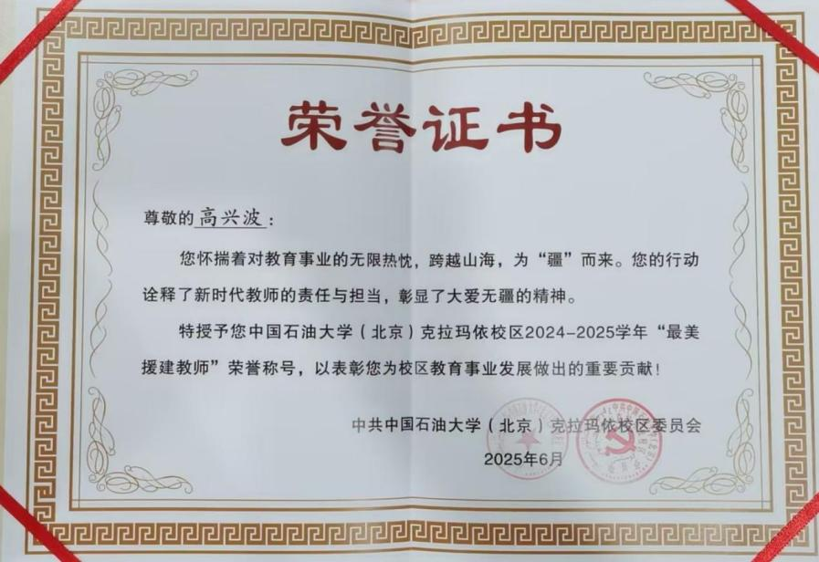 公司高兴波老师荣获中国石油大学(北京)克拉玛依校区2024-2025学年”最美援建教师“荣誉称号。