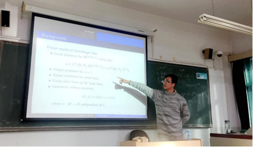 在报告中,宋翀副教授从虚数i在平面上描述直角旋转这一几何观察出发解释了物理中两类经典偏微分方程热方程与薛定谔方程的联系与区别,并介绍了与旋涡运动有关的几类经典方程包括DaRios方程、铁磁链方程、薛定谔流以及 斜中曲率流等模型。随后宋翀副教授介绍了薛定谔型方程的一些性质以及孤立子解的几何描述,并从分析层面直观解释了在使用能量估计的办法研究方程唯一性问题中,非线性薛定谔方程因方程结构导致的本质性的困难。之后宋翀副教授向与会的师生们报告了他在斜中曲率流的研究工作中的最新成果,用几何内蕴的办法给出的关于唯一性的证明。