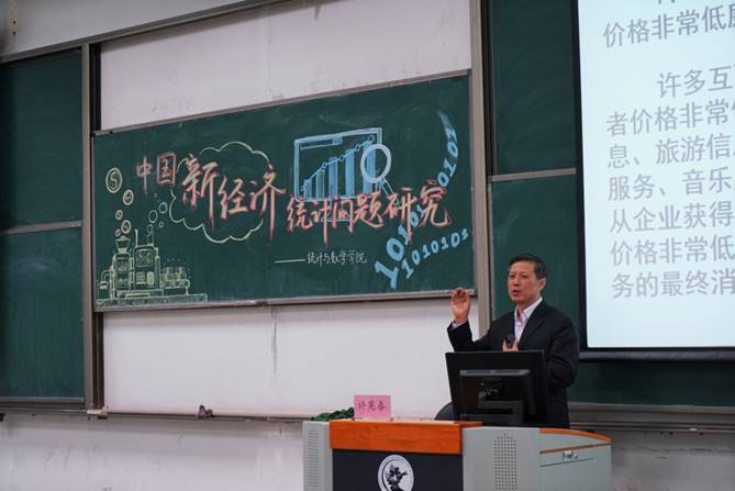 许教授从新经济在中国经济发展和人民生活中的作用、新经济给政府统计带来的严峻挑战、国家统计局关于新经济统计开展的工作三个方面向同学们作了介绍。