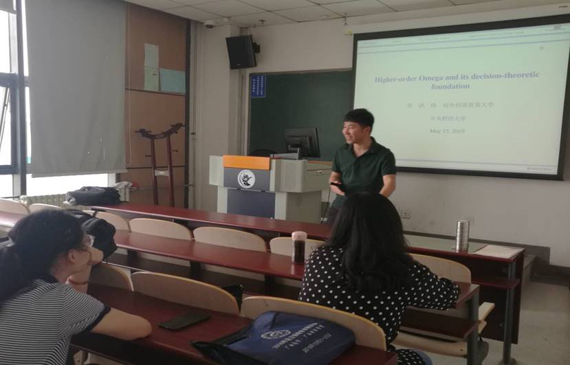 2019年5月15日,对外经贸大学保险公司副教授毕洪伟老师应邀到公司做了题为“Higher-orderOmega and its decision-theoretic foundation”的报告。