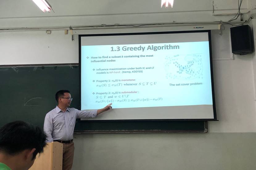 周川副研究员的报告分三部分,详细介绍了近年来其团队在影响最大化、社交推荐系统和欺诈检测等问题上所取得的研究结果。在影响最大化问题上,从算法、数据和模型这三个层面出发,分别提出了基于目标函数上界的剪枝式处理方法、基于子图流的增量式处理方法和基于网络粗化的映射式处理方法,构建了一套完整的大规模网络影响最大化问题求解方案;在社交推荐问题上,引入了本质偏好空间这个新概念,为刻画用户的社交倾向与购物倾向提供了一种新的建模思路;针对欺诈检测问题,提出了基于深度结构学习的DeepFD模型,大幅提升了欺诈检测问题的求解性能。