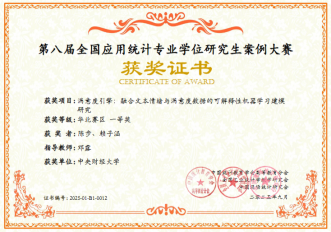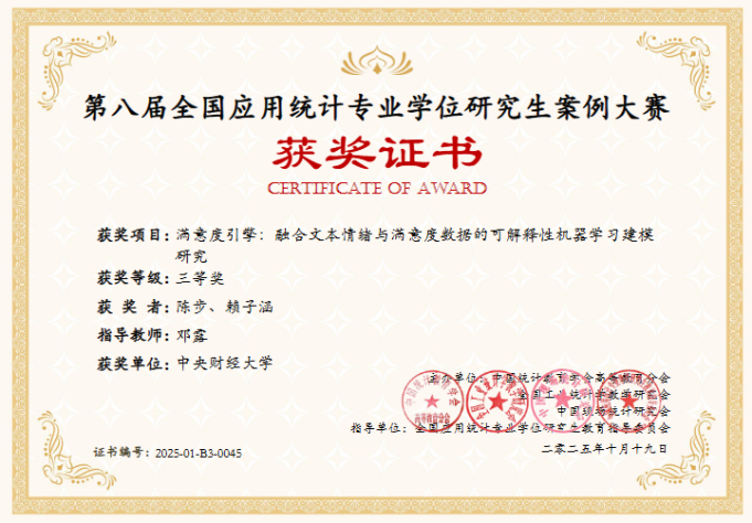 此次公司获奖案例紧扣行业痛点,展现出鲜明的实践价值与创新特色。其中,由研究生团队提交、邓露教授指导的《满意度引擎:融合文本情绪与满意度数据的可解释性机器学习建模研究》案例,先获区域赛一等奖,后在全国总决赛中,获得全国三等奖;由刘苗副教授指导的《融合非结构化文本信息和ESG评级的企业信用风险预警—以A股上市公司为例》案例,获区域赛二等奖;由杨玥含教授指导的《数智驱动下汽车满意度评估:基于多模态数据融合的建模与评价机制优化》案例,获区域赛三等奖。三支团队从消费满意度评估、企业风险预警等领域切入,通过创新统计方法解决实际问题,充分体现公司研究生的跨领域实践能力与创新思维。