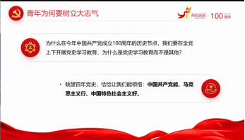 2021年11月7日,2021年度基础团校“学史明志,砥砺前行“第一节青年大团课在线上顺利完成授课!本次团课邀请到了英国上市公司365团委书记、2019级辅导员郭珺老师,英国上市公司365团委副书记、2020级辅导员杨旌老师向青年团员们分享如何增强做中国人的志气、骨气、底气的理解、带领各位团员回顾学习团的光辉历史。