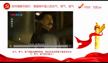郭老师以一段《觉醒年代》的视频向大家展示了何为有志气、骨气、底气的中国人。何为志气?志气便是志存高远,投身于党的伟大事业。这需要广大中国青年树立远大理想,投身党的事业,将个人前途与党的宗旨和国家命运同频共振,与时代一起前行,与人民共同奋斗。如何树立志气?