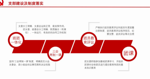 落实“三会两制一课”,各支部定期召开支部大会、团支委会和团小组会,做好团员教育评议工作和团员年度团籍注册工作,上好、听好、学好团课,加强团员思想政治教育和自我教育,强化团员意识。恰逢建党百年之际,各支部也积极开展党史学习教育,开展主题团日活动,以青春之名为党献礼。