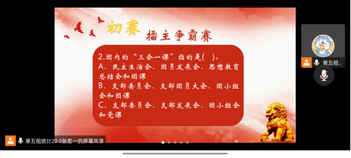 擂台争霸环节,十三个小组分别在四个会议室决出擂主。为了满足线上答题的需要,四名主持人在各自负责的会议室中发布群投票,让各位同学以投票的形式选出答案。并根据答题情况数据统计分数,决出擂主。得分最高的小组即为擂主组,擂主组与其他组各派三名代表进入微信群通过小程序进行抢答,并由主持人将抢答过程实时共享给会议室中的非代表同学。热烈的抢答气氛点燃全场。