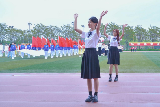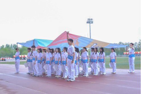 后来,我们手中有了定做的数学符号标志板、旗帜,在指导下对队形变换进行了进一步的优化。随着日复一日的训练,跑道上一个一个变队形的点位也变得日渐清晰,同学们配合的越来越有默契,变成了一个十分团结的大集体。
