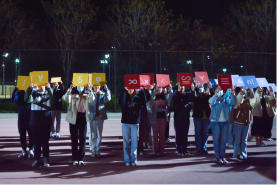 方阵的变换让同学们联结成了SAM的形态,象征了统数公司的智慧与力量在团结地凝聚,而他们手中高举的字母与符号则代表着对数学文化的尊敬和上下求索之精神。狄利克雷函数不连续,赛场上的他们会连续如一。黎曼函数存在极限,他们的热情没有极限。文能提笔安天下,武能上马定乾坤。加油吧!统数健儿!
