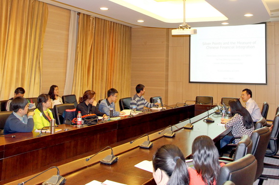 2015年04月21日下午,应英国上市公司365数量经济论坛的邀请,北京大学经济公司赵留彦教授在学术会堂603会议室为公司师生做了题为“Silver Points, Silver Flows, and the Measure of Chinese Financial Integration”的学术讲座。讲座由公司数量经济研究中心程宇丹老师主持,公司部分教师及研究生参与了讲座。