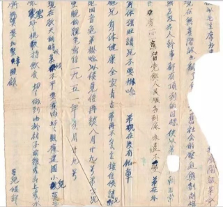 ”吃水别忘了挖井人,吃食别忘了毛主席的恩,我们应永远跟着共产党走,积极生产,搞副业,努力支援朝鲜战争,争取当模范军属。弟在前方多杀敌人,把美帝鬼子消灭在朝鲜,保卫家和祖国……“