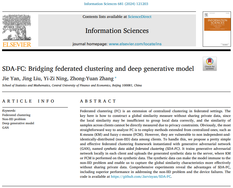 张忠元教授及其博士生团队在公司AAA级期刊Information Sciences发表了桥接联邦聚类和深度生成模型的论文。